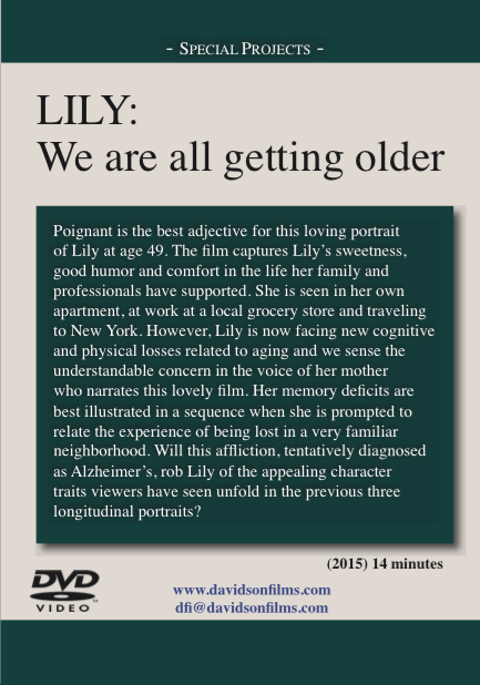 Poignant is the best adjective for this loving portrait of Lily at age 49. The film captures Lily-s sweetness, good humor and comfort in the life her family and professionals have supported, She is seen in her own apartment, at work at a local grocery store and traveling to New York. However, Lily is now facing new cognitive and physical losses related to aging and we sense the understandable concern in the voice of her mother who narrates this lovely film. Her memory deficits are best illustrated in a sequence when she is prompted to relate the experience of being lost in a very familiar neighborhood. Will this affliction, tentatively diagnosed as Alzheimer's, rob Lily of the appealing character traits viewers have seen unfold in the previous three longitudinal portraits?